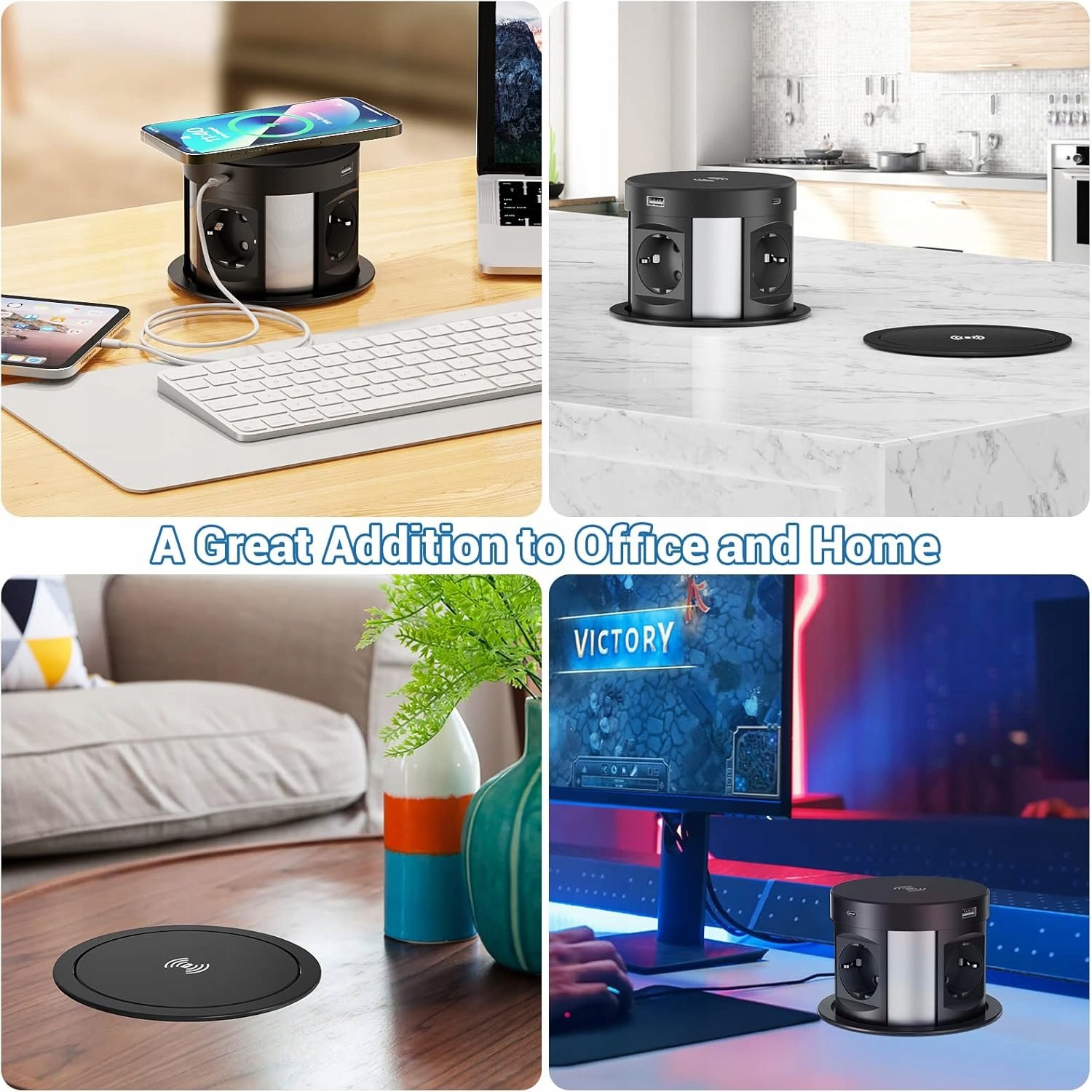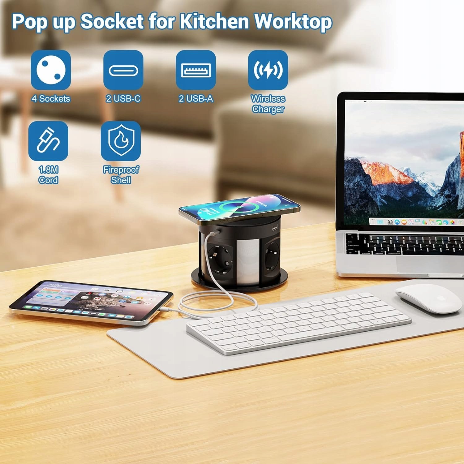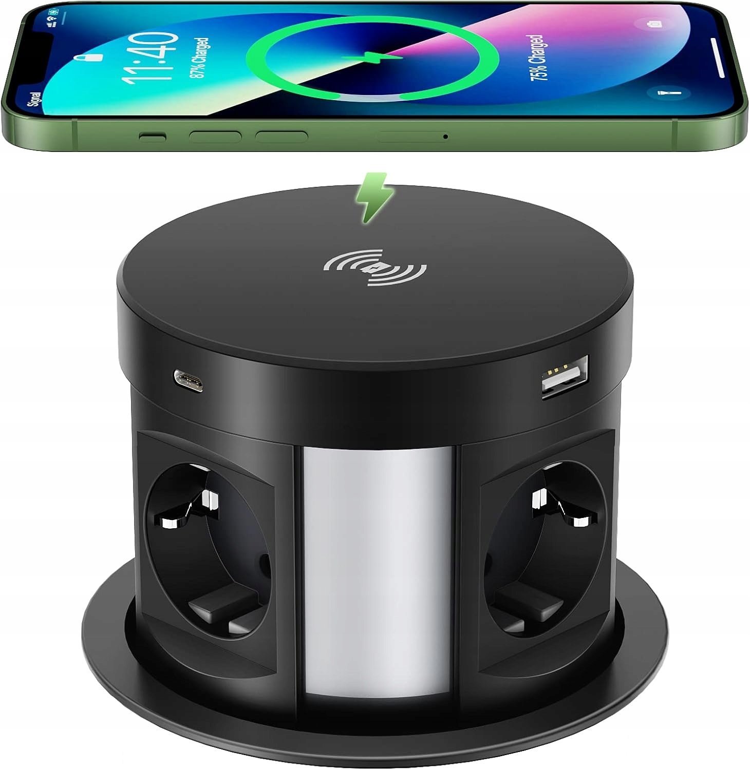 Wysuwane gniazdo stołowe wyposażone w 4 gniazda sieciowe, 2 porty USB‑C oraz 2 porty USB‑A to praktyczne rozwiązanie do kuchni, biura i stanowisk roboczych. Umożliwia wygodne podłączanie urządzeń oraz szybkie ładowanie — łączna moc portów USB to 5 V / 3,1 A (15,5 W). Dodatkowo posiada bezprzewodowe ładowanie 5 W na górnym panelu.