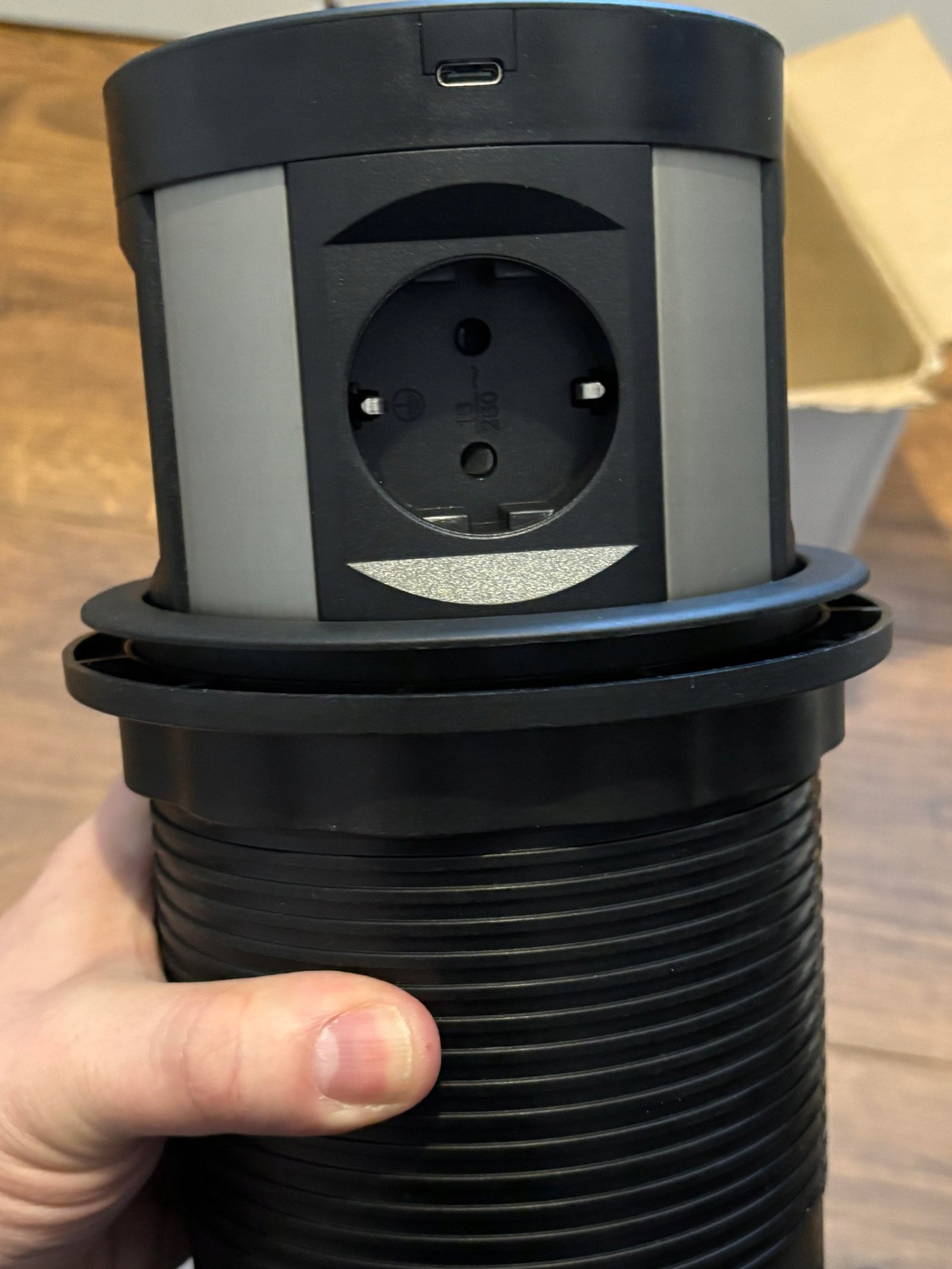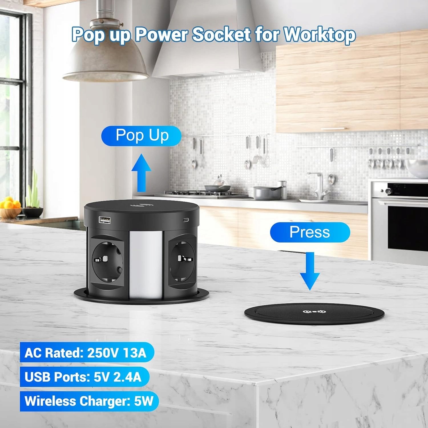 Mechanizm pop‑up pozwala ukryć gniazdo, gdy nie jest używane, dzięki czemu blat pozostaje czysty i uporządkowany. Konstrukcja jest kompaktowa, więc nie zajmuje dużo miejsca w szafce czy szufladzie pod blatem.