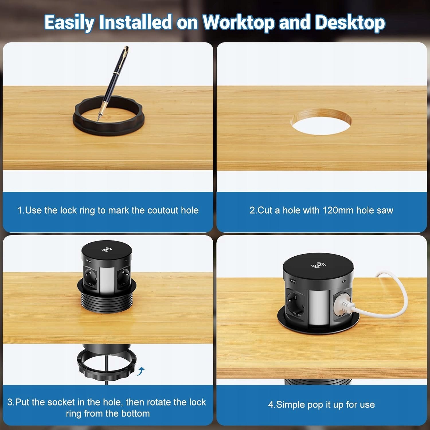 Montaż jest prosty i szybki. Wystarczy użyć dołączonego pierścienia, aby odrysować otwór o średnicy 120 mm, wyciąć go otwornicą 120 mm, włożyć gniazdo w blat, a następnie dokręcić pierścień od spodu, obracając go przeciwnie do ruchu wskazówek zegara.