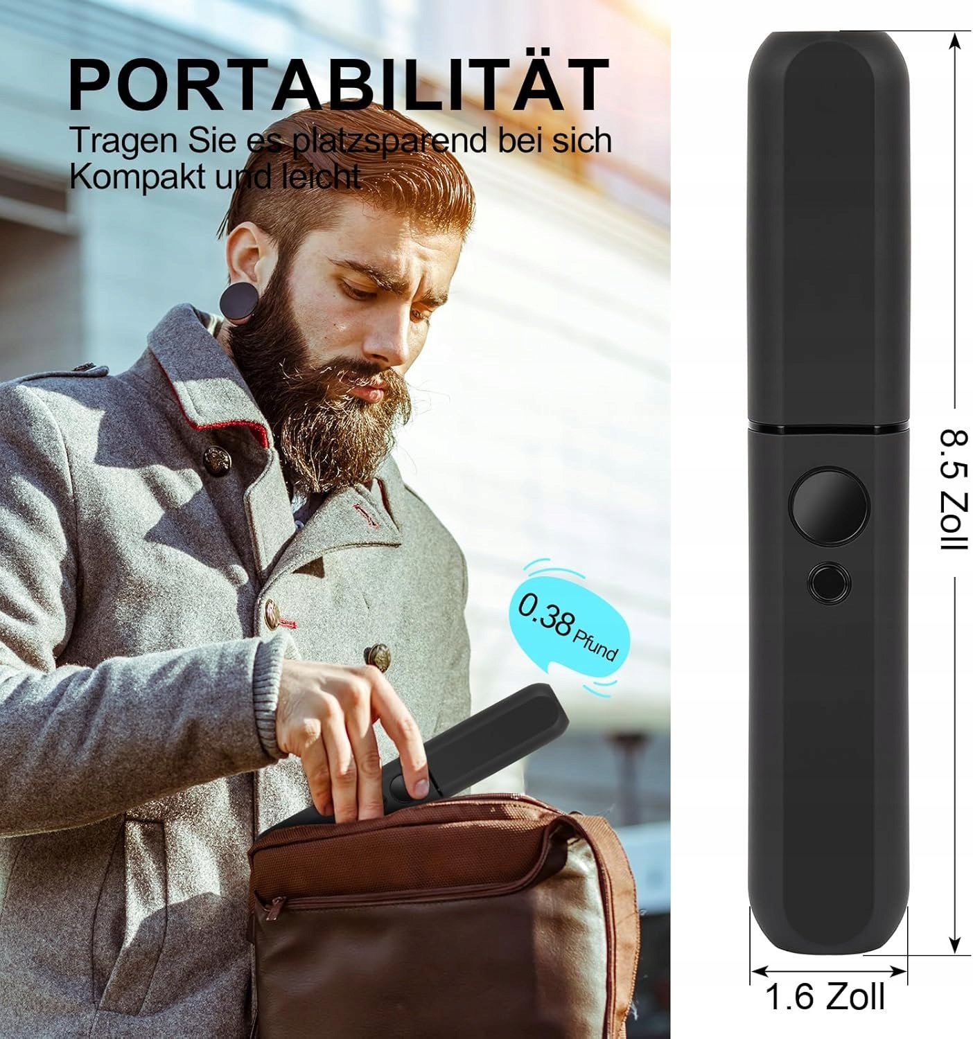 Szczotka ma 8,5 cala długości, 1,6 cala szerokości i waży jedynie 0,17 kg, dzięki czemu bez trudu mieści się w torbie, plecaku albo większej kieszeni. Idealna do użytku w domu, w pracy, w podróży oraz na świeżym powietrzu – zawsze pod ręką, gdy chcesz szybko odświeżyć wygląd.