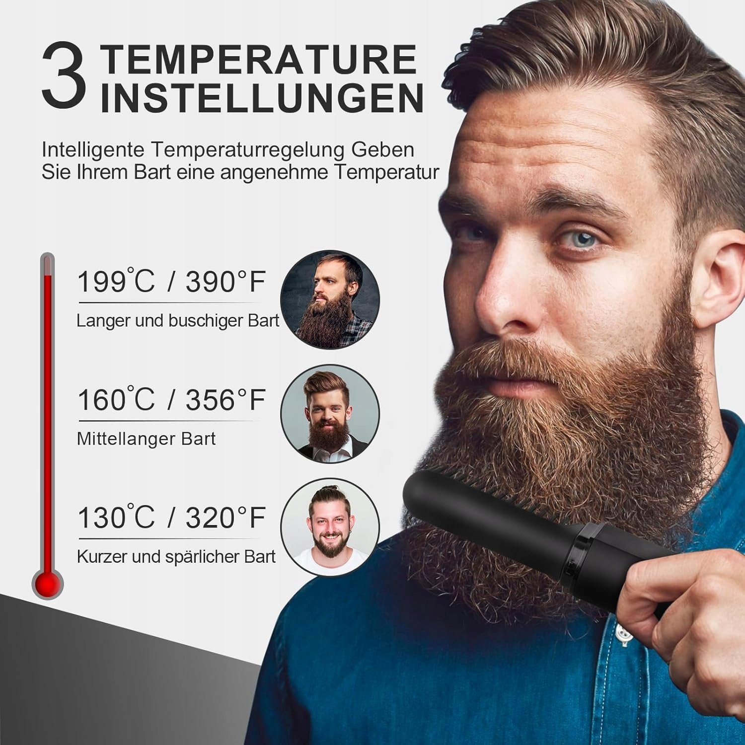 Prostownica oferuje trzy ustawienia temperatury: 130°C / 160°C / 199°C, dzięki czemu idealnie dopasujesz ciepło do rodzaju i gęstości swojej brody. Wyraźny wyświetlacz LED prezentuje wybraną temperaturę oraz poziom baterii. Obsługa jednym przyciskiem sprawia, że urządzenie jest proste, wygodne i intuicyjne.